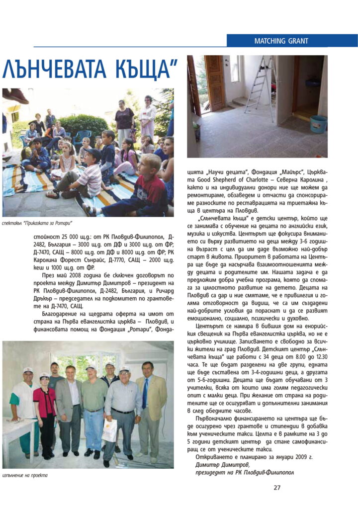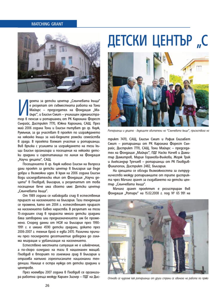 “Слънчевата къща” е детски център,който ще се занимава с обучение на децата по английски език,музика и изкуства.Центърът ще фокусира вниманието си върху развитието на децата между 396 годишна възраскт с цел да им даде възможно най-добър старт в живота.Приоритет в работата на центъра ще бъде да насърчава взаимоотнощенията между децата и родителите им.Нашата задача е да предложим добра учебна програма,която да спомага за цялостното развитие на детето.Децата на Пловдив са дар и ние считаме,че е привилегия и голяма отговорност да видиш,че са им създадени най-добрите условия да пораснат и да се развият емоционално,социално,психически и духовно.